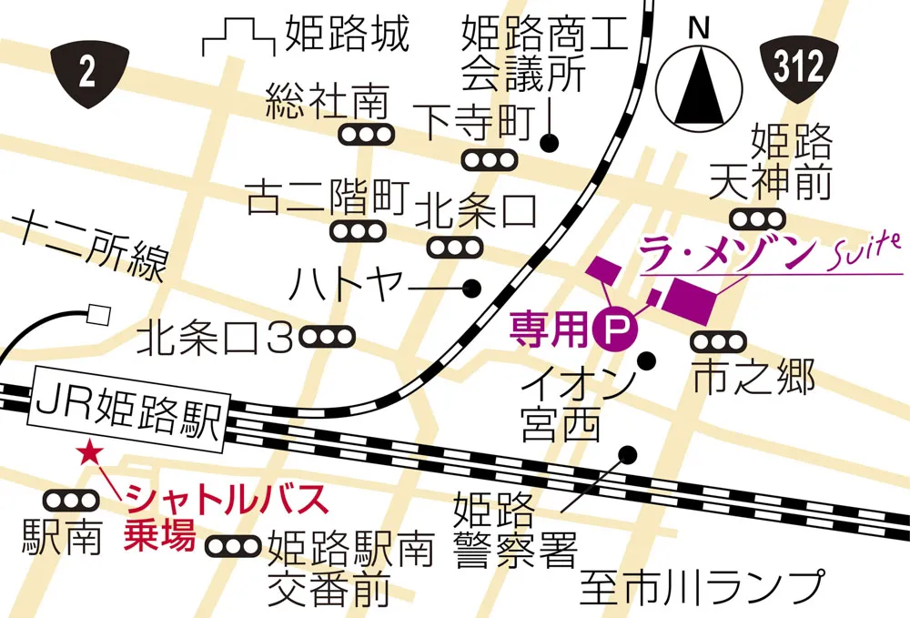 第1駐車場(ラ・メゾン Suite施設内)、第2駐車場(施設から40m西)、第3駐車場(施設から300m西のラヴィーナ姫路駐車場)をご利用ください。