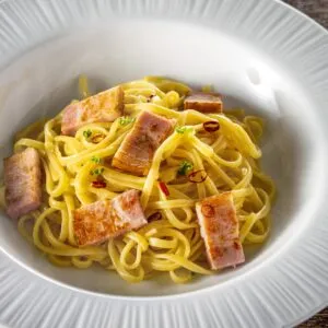 ・厚切りベーコンと温泉卵のカルボナーラ